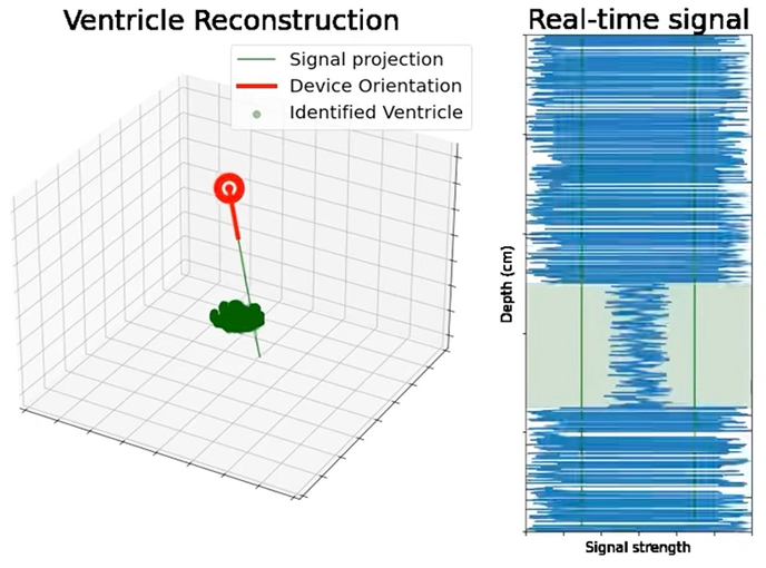 Our 3D reconstruction algorithm identifies and reconstructs the ventricles, allows the neurosurgeon to choose their trajectory, and shows them their trajectory, so they can follow the placement all the way into the ventricle.